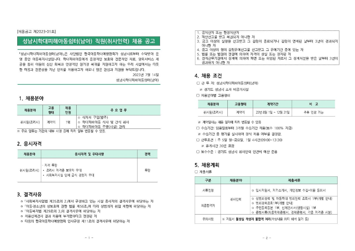 [채용마감][긴급연장2] 성남시 학대피해아동쉼터 남아시설 직원(취사인력) 채용공고